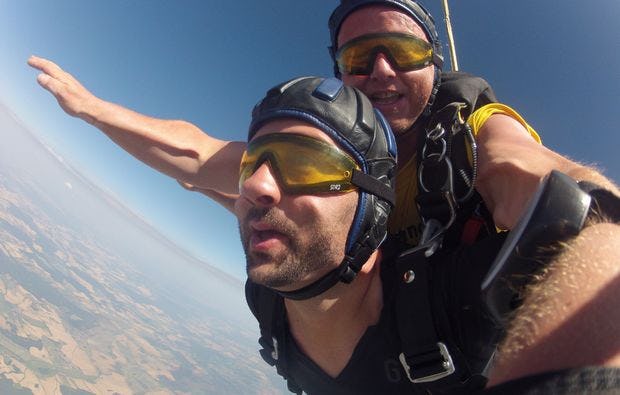 Bevor Du in die Luft gehst, wirst Du von einem erfahrenen Tandemmaster in die Faszination Fallschirmspringen eingeweiht. Er erzählt Dir genau, was Dich beim Tandemsprung erwartet und beantwortet all Deine Fragen. Ausgestattet mit modernster Ausrüstung besteigt ihr nun für den Fallschirm-Tandemsprung das Flugzeug. In 3.000 bis 4.300 Metern Höhe heißt es dann: Aussteigen! Ganz schön hoch, oder? Da wird schon das Runterschauen zum Abenteuer... Aber Du nimmst Deinen Mut zusammen und wagst den Sprung.