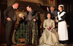 Seine Witwe empfängt die illustren Gäste im Speisesaal des schottischen Herrensitzes an üppig dekorierten Tischen zum Leichenschmaus.