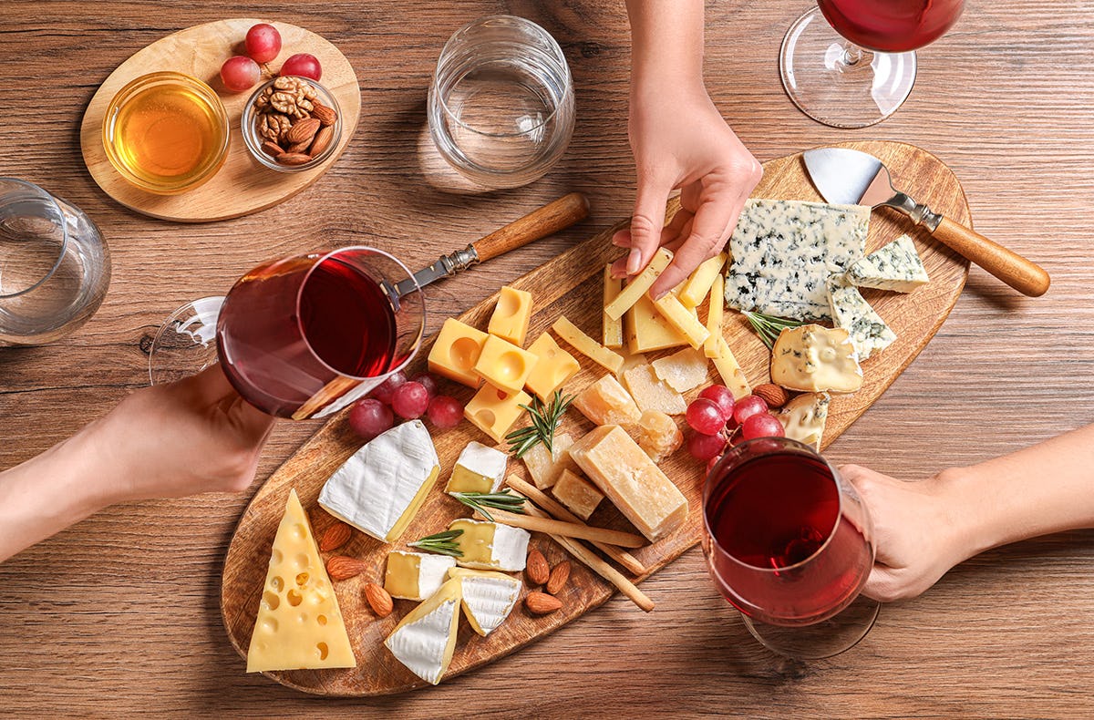 - Fachlich kommentierte Verkostung von 8 verschiedenen Weinen und 8 verschiedenen Käsesorten