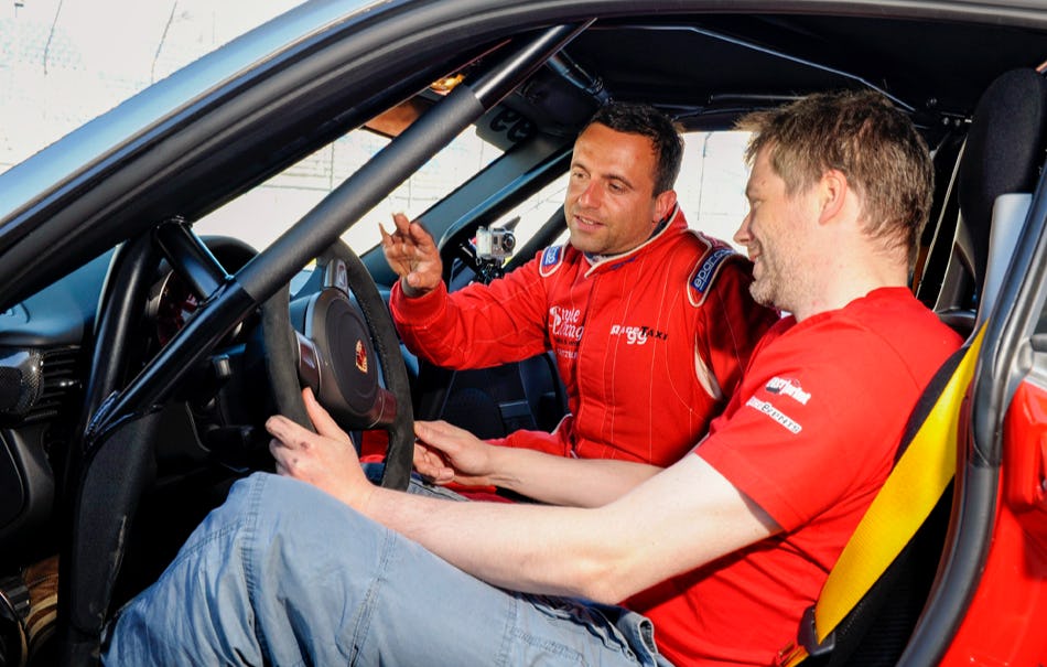 Mit einer Leistung von 430 PS schafft es der Porsche 911 GT3 in 4,2 Sek von 0 auf 100 km/h. Die Spitzengeschwindigkeit des Rennboliden beläuft sich dabei auf unglaubliche 330 km/h! Und dann stehst Du vor ihm. In dem Renn-Overall kommst Du Dir vor, wie ein echter Rennfahrer. Ein erfahrener Rennwagenpilot gibt Dir eine kurze Einweisung in den Porsche und fährt auch die ersten 2 Runden. Schon auf dem Beifahrersitz spürst Du, wie sich das Adrenalin in Deinem Körper ausbreitet.Dein Rennstreckentraining