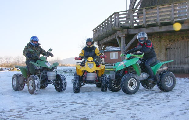 Genug geredet, Du willst endlich losfahren? Zieh Dir zunächst noch die obligatorische Sturmhaube und den Helm über, bevor Du schließlich den Motor anlassen kannst. Anfangs startet Ihr noch recht gemächlich auf befestigten Wegen, später nehmt Ihr zunehmend mehr Fahrt auf und lasst schließlich auch den Asphalt hinter Euch. Beim Quadtour fahren in Rheine seid Ihr circa 30 Prozent der 2,5-stündigen Fahrt offroad unterwegs. Um Versicherungsfragen oder Treibstoffkosten musst Du Dir übrigens keine Gedanken machen: Die sind inklusive. Genieße jede Sekunde beim Quadtour fahren in Rheine!