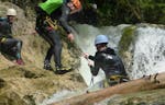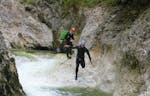 Der Start der fünfstündigen Canyoning-Tour beginnt mit einem leichten Aufstieg zur Einstiegsstelle. Von dort aus seilst Du Dich vom Felsen in Richtung Wasser ab und bist froh über den schützenden Neoprenanzug. Im weiteren Verlauf gleitest Du über natürliche Rutschbahnen und springst in Wasserbecken hinein. Hier hast Du die Möglichkeit, sowohl die Kraft der Natur unverfälscht zu erleben als auch in sportlicher Hinsicht Deine persönlichen Grenzen auszutesten.
