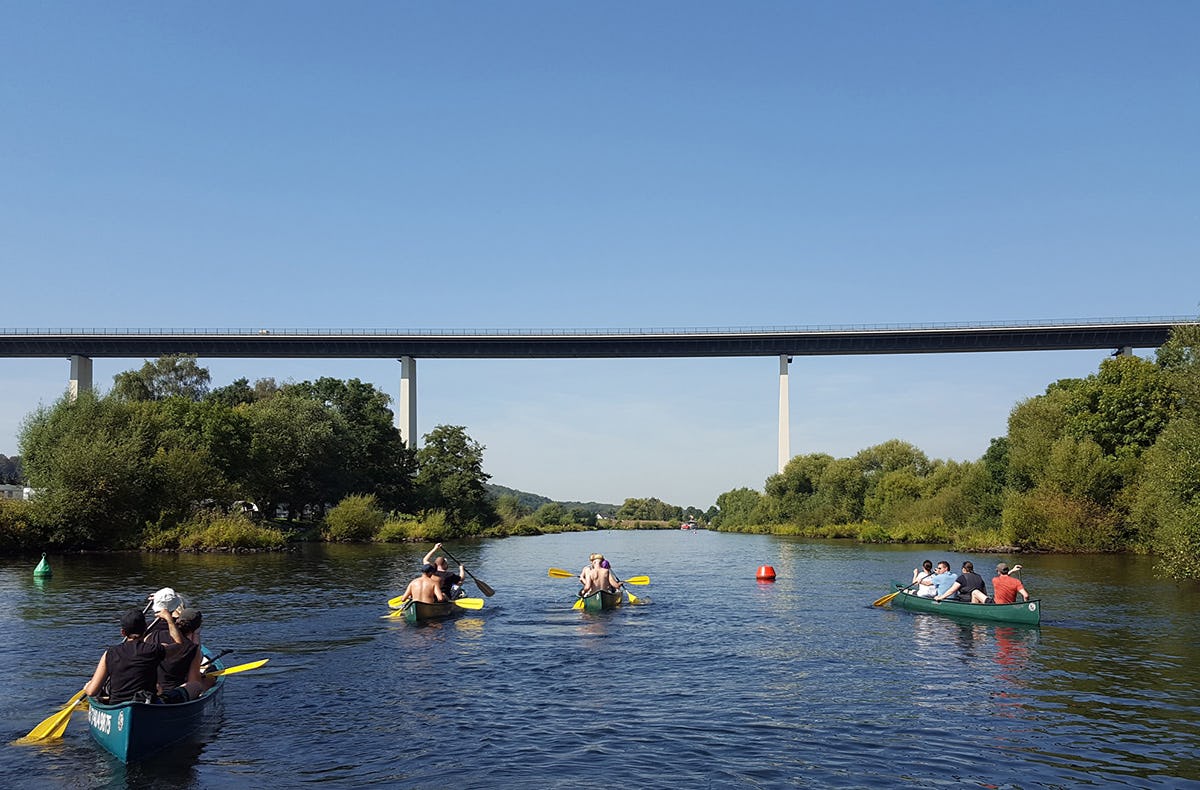 Bist Du am Treffpunkt in Essen-Kettwig angekommen, wirst Du vom freundlichen und erfahrenen Instruktor herzlich in Empfang genommen. Die Kanus werden in der Zwischenzeit zur Einsatzstelle nach Essen-Kettwig transportiert. Bevor es mit der Kanutour so richtig los geht, bekommst Du vom Profi eine Einweisung in die Technik des Paddelns und in den Verlauf der Strecke. Wenn Du alles verstanden hast, wird Dir auch schon die erforderliche Ausrüstung gestellt. Du bekommst Schwimmwesten und ein Paddel. Deine Wertsachen und die Kamera kannst Du in einem wasserdichten Packsack verstauen und mit auf die Kanutour nehmen. Dann geht es auch schon ab zur Einstiegsstelle. Du setzt Dich in einen der 4er Kanadier und schon kann es losgehen.